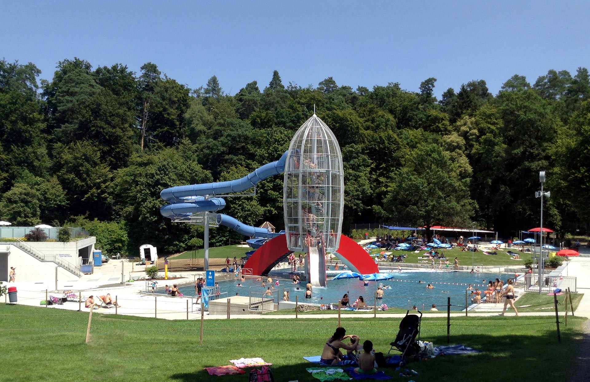 Die Beck Schwimmbadbau AG gewann den Gestaltungswettbewerb der Stadt Kloten. Das Sanierungskonzept greift den naheliegenden Flughafen Kloten als Referenz auf. Die Wegeführung entspricht den Pisten des Flughafens, die Rakete im Nichtschwimmerbereich mit den integrierten Rutschbahnen symbolisieren den Flugbetrieb bzw. die Luftfahrt. Das Kinderplanschbecken mit einem Schifflibach und diversen Attraktionen wurde neu erstellt. Im Bereich des Schwimmerbeckens bereichert neu ein Strömungskanal wie auch diverse Massagen- und Nackendüsen den Badebetrieb.